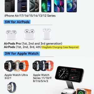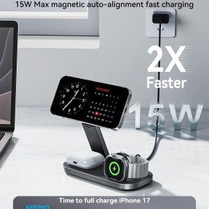 3 in 1 Wireless Charging Station for Apple Devices, Magnetic Foldable Fast Charger Stand Compatible with MagSafe for iPhone Air/17/16/15/14/13/12 Series, Apple Watch & AirPods Pro/4/3/2